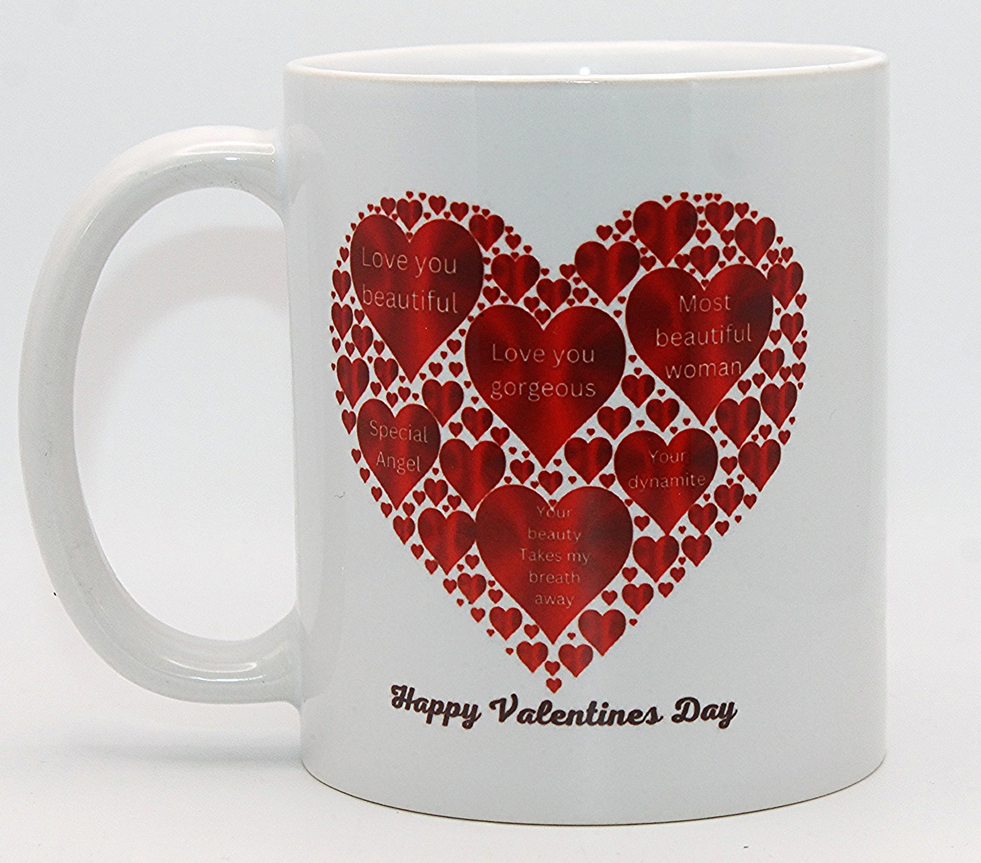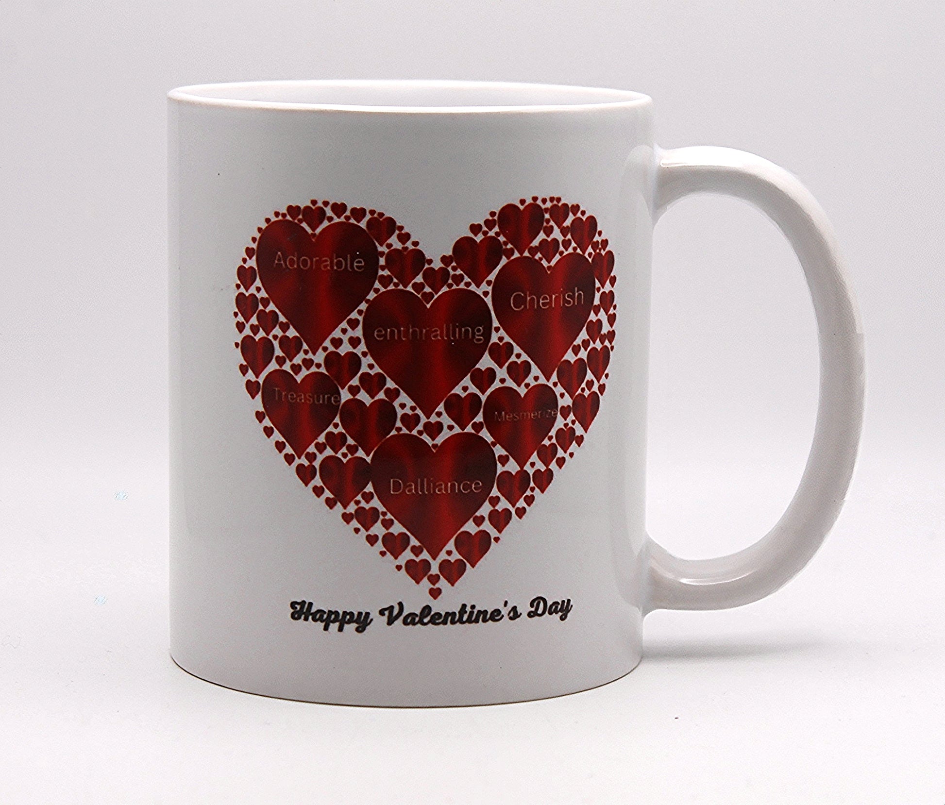 11oz. Ceramic mug with a heart-shaped Valentine's Day design that is dishwasher safe and microwave safe.